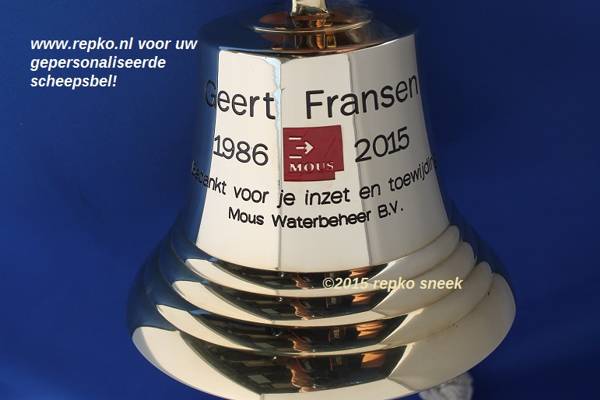 Repko levert scheepsbellen in diverse uitvoeringen, en graveert deze uiteraard ook. De zogenoemde “bar” of wel “kroeg” bel compleet met ophangbeugel en bellekoord.